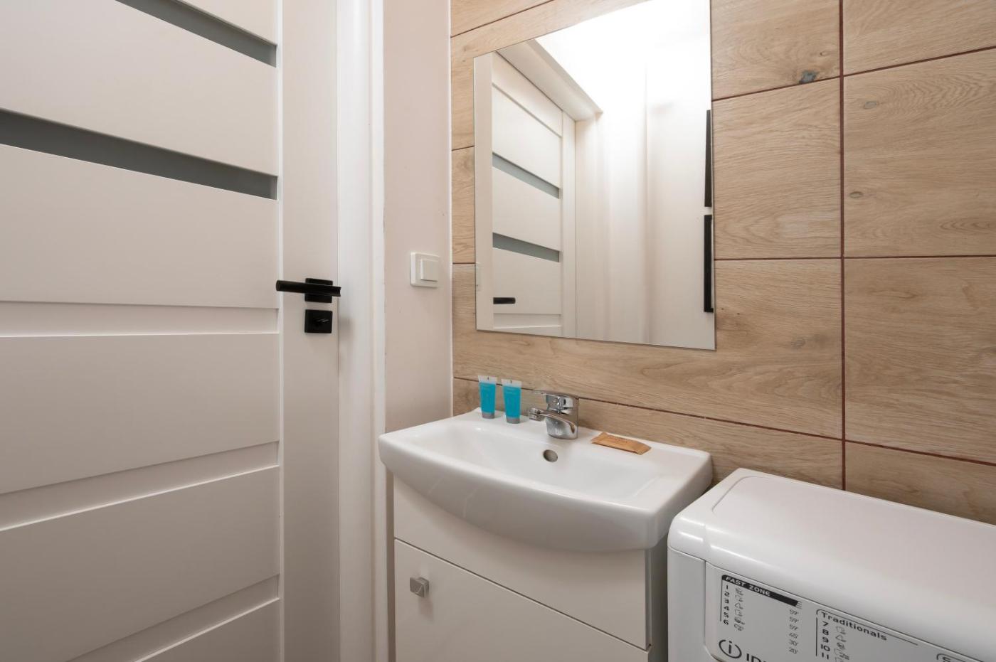 Studio. The studio features a washing machine, a private entrance, as well as a private bathroom boasting a shower and a hairdryer. Guests can make meals in the kitchenette that features a stovetop, a refrigerator, kitchenware and an oven. The studio is fitted with a tea and coffee maker, a seating area, a dining area as well as a wardrobe. The unit has 2 beds. Studio - 2 osobowy. Powierzchnia pokoju ok.: 24 mkw.
